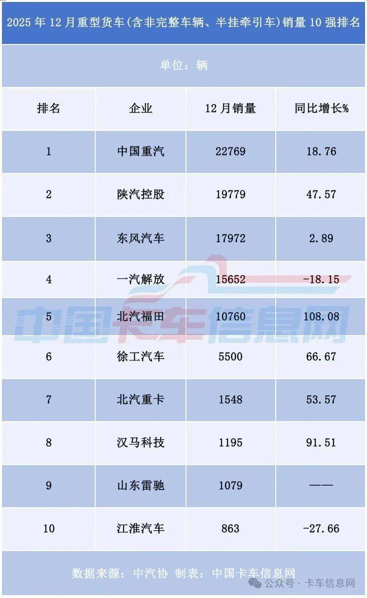 从累计销量来看,2025年,中国重汽以304857辆的销量成绩,夺得年度销量冠军。解放销售215526辆,排在第二位,与2024年度排名保持一致。陕汽销售184009辆,排在第三位,与2024年度排名保持一致。东风销售181459辆,排在第四位,与2024年度排名保持一致。福田销售142185辆,排在第五位,与2024年度排名保持一致。徐工销售40127辆,排在第六位,较2024年上升一位。汉马科技销售13252辆,排在第七位,较2024年上升五位。江淮销售12830辆,依旧排在第八位。北汽销售11002辆,排在第九位,较2024年上升一位。奇瑞销售7225辆,排在第十位,较2024年上升五位。